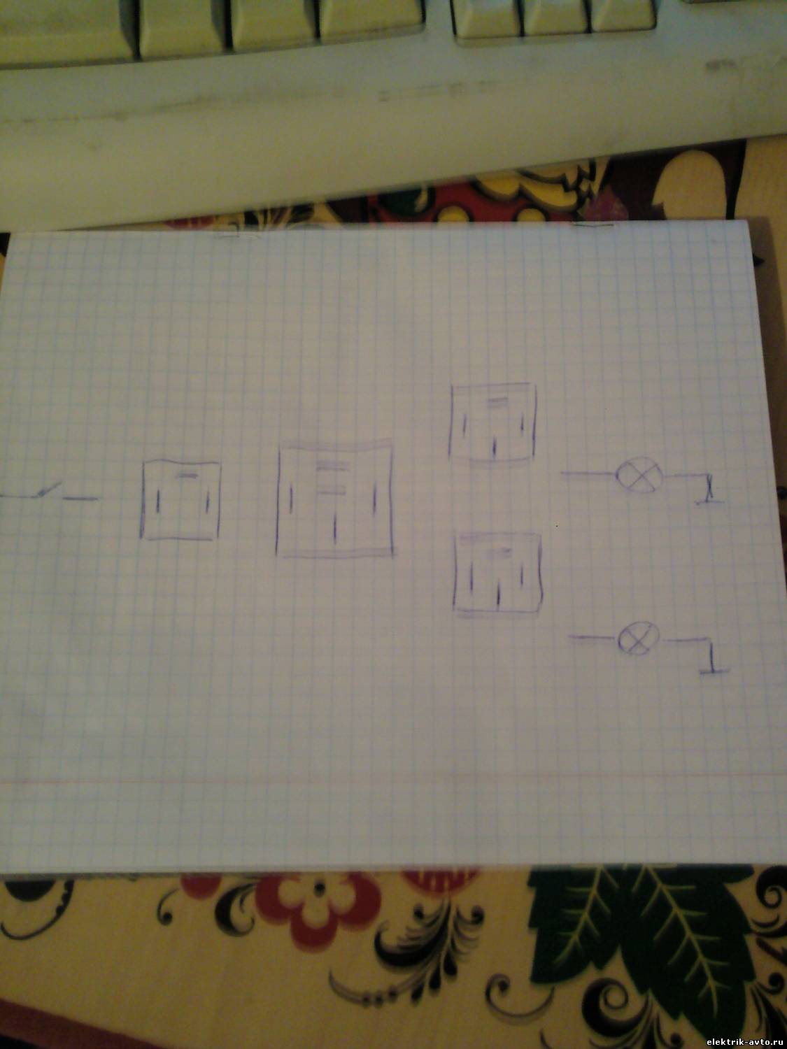 помогите решить схему. стоит реле поворотов, потом обычное реле с 5 контактами, потом 2 замыкающих реле с 4 контактами, потом 2 лампочки. нужно чтобы лампы мигали по очереди с переодичностью 1 секунда Нагрузка на реле поворотов должна быть 10 ампер