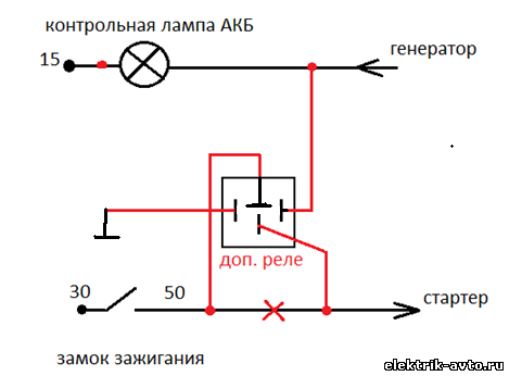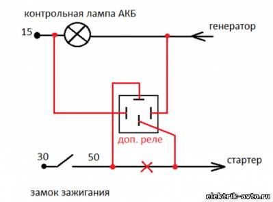 Но возникла загвоздка с другим заданием. Вот условие. "Задание 1. Приезжаетклиент и говорит: «На моей машине ездит жена, каждый раз при запуске автомобиля она передерживает работу стартера, он может сгореть. Мне нужно сделать, так что бы, как только машина завелась, стартер выключался».Необходимосоставить и нарисовать схему, что бы при запуске автомобиля, как только автомобиль завёлся, стартер сразу выключился, хотя при этом можно держать ключ замка зажигания в положении «стартер».Необходимонарисовать две схемы подключения. В обоих ставится только одно реле. Использовать контрольную лампу давления масла нельзя."