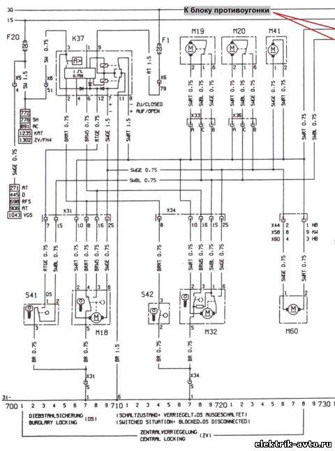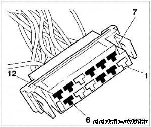 Нашел вот такую схему в сети. Может кто заглянет в тему и ему это пригодится. 1 — — 2 входящий сигнал "LOCK" с передних дверей, коричневый с красным 3- питание +12 от зажигания(линия 15) через предохранитель F20, чёрный 4- — 5- — 6- входящий сигнал "UNLOCK" с передних дверей, коричневый с чёрным 7- выходной сигнал на сервомоторы, закрытие(+) — открытие(-), чёрный с жёлтым 8- выходной сигнал на сервомоторы, закрытие(-) — открытие(+), чёрный с красным 9- питание +12 (постоянное, линия 30) через предохранитель F1, красный 10- — 11- масса, коричневый 12- выход, активация ATD(anti-theft device, противоугонки), красный с жёлтым