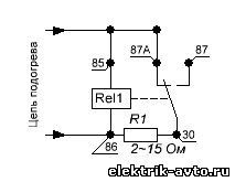 Через колодку,по идее если всё получится реле с колодкой будет либо в салоне либо под капотом,и паять что-либо где-либо кроме салона авто(и там пять в редких случаях) не желательно... Повторяю принцип реле. Итак без подачи на катушку реле питания,контакты реле держат замкнутую цепь подогрева через сопротивление,при проверочных импульсах например перед включением подогрева ток идет через сопротивление,так как реле инертно,то есть включается не мгновенно от подачи на реле питания а спустя несколько милисекунд за это время ЭБУ успевает проверить ток протекающий через сопротивление и "подумать" что подогреватель цел,сразу после этого начинает поступать питание на собственно сам подогрев,реле уже успевает сработать,и переключает контакты с 30/87а на 30/87 размыкая цепь с сопротивлением(поэтому вывод реле №87 свободен),сопротивление не греется,поэтому в случае с реле важна не мощность,так как реле успевает его выключить из цепи и оно не нагревается.